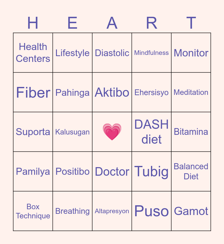 This bingo card has a free space and 51 words: Calcium, Referrals, Systolic, Puso, Bitamina, Balanse, Lifestyle, Prutas, Mindfulness, Heart Health, Health Centers, Pahinga, Altapresyon, DASH diet, Meal Plan, Blood Pressure, Kalusugan, Aktibo, Screening, Meditation, Fiber, Low Salt, Diastolic, Ehersisyo, Pinggang Pinoy, Box Technique, Positibo, Mineral, Tubig, Monitor, Enerhiya, Emosyon, Tulog, Gulay, Relaxation, Pamilya, Saya, Katawan, Follow-Up, Whole Foods, Suporta, Grounding Technique, Check-up, Kontrol, Gamot, Isip, Breathing, Doctor, Active, Balanced Diet and Continuity of Care.