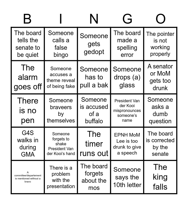 This bingo card has 30 words: There is a problem with the presentation, A department is misnamed as a committee, Someone braveers by themselves, The presentation screen falls over when someone walks in/out, The board tells the senate to be quiet, Someone gets gedopt, Someone accuses a theme reveal of being fake, The timer runs out, President Van der Kooi mispronounces someone’s name, The board forgets about the mos, Someone asks a dumb question, Someone is accused of a buffalo, Someone says the 10th letter, The king falls, A senator or MoM gets too drunk, The management selfhypes, EPNH MoM Lee is too drunk to give a speech, G4S walks in during GMA, Someone forgets to shake President Van der Kooi’s hand, The pointer is not working properly, There is no pen, A board member forgets to take off their “penning”, Someone calls a false bingo, Someone drops (a) glass, The alarm goes off, The board made a spelling error, The board is corrected by the senate, A committee/departement is mentioned without a bravo, Someone has to pull a bak and MoM Kok tells a joke.
