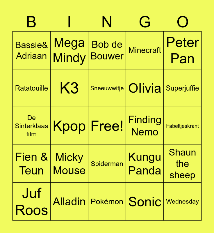 This bingo card has a free space and 24 words: Micky Mouse, Alladin, Sneeuwwitje, Juf Roos, Peter Pan, Bassie& Adriaan, Ratatouille, Mega Mindy, Finding Nemo, Spiderman, OIivia, De Sinterklaas film, Kungu Panda, Shaun the sheep, K3, Sonic, Fabeltjeskrant, Bob de Bouwer, Superjuffie, Kpop, Wednesday, Fien & Teun, Minecraft and Pokémon.