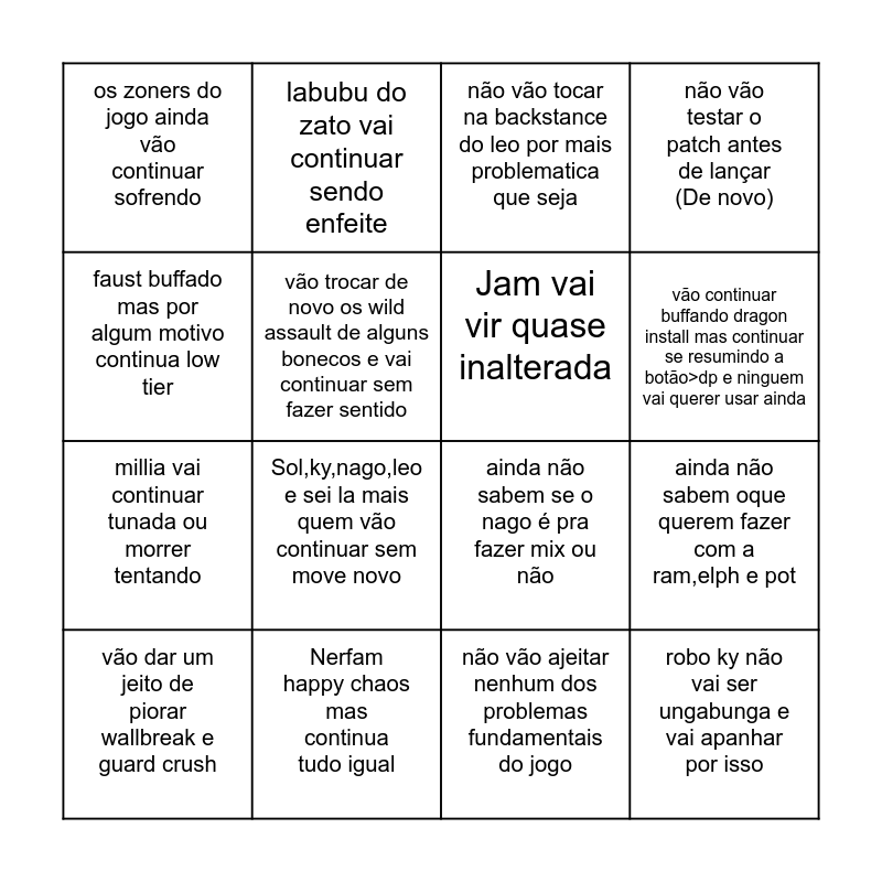 This bingo card has 16 words: Nerfam happy chaos mas continua tudo igual, ainda não sabem oque querem fazer com a ram,elph e pot, não vão tocar na backstance do leo por mais problematica que seja, os zoners do jogo ainda vão continuar sofrendo, millia vai continuar tunada ou morrer tentando, labubu do zato vai continuar sendo enfeite, ainda não sabem se o nago é pra fazer mix ou não, não vão ajeitar nenhum dos problemas fundamentais do jogo, faust buffado mas por algum motivo continua low tier, vão trocar de novo os wild assault de alguns bonecos e vai continuar sem fazer sentido, vão dar um jeito de piorar wallbreak e guard crush, não vão testar o patch antes de lançar (De novo), Sol,ky,nago,leo e sei la mais quem vão continuar sem move novo, vão continuar buffando dragon install mas continuar se resumindo a botão>dp e ninguem vai querer usar ainda, Jam vai vir quase inalterada and robo ky não vai ser ungabunga e vai apanhar por isso.