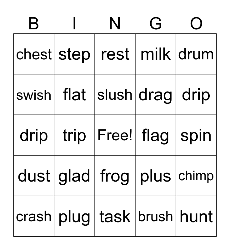 This bingo card has a free space and 24 words: glad, plug, slush, crash, drum, chest, swish, step, flag, frog, drag, drip, plus, chimp, flat, brush, spin, rest, drip, trip, hunt, dust, milk and task.