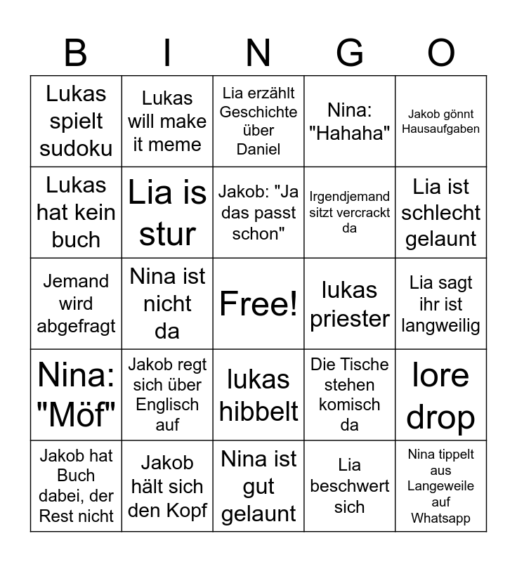 This bingo card has a free space and 24 words: Jakob regt sich über Englisch auf, Jakob hält sich den Kopf, Jakob: "Ja das passt schon", Jakob hat Buch dabei, der Rest nicht, Jakob gönnt Hausaufgaben, Lukas spielt sudoku, Lukas hat kein buch, Lukas will make it meme, lukas priester, lukas hibbelt, Irgendjemand sitzt vercrackt da, Jemand wird abgefragt, Die Tische stehen komisch da, lore drop, Lia is stur, Lia beschwert sich, Lia sagt ihr ist langweilig, Lia erzählt Geschichte über Daniel, Lia ist schlecht gelaunt, Nina ist nicht da, Nina tippelt aus Langeweile auf Whatsapp, Nina: "Möf", Nina: "Hahaha" and Nina ist gut gelaunt.
