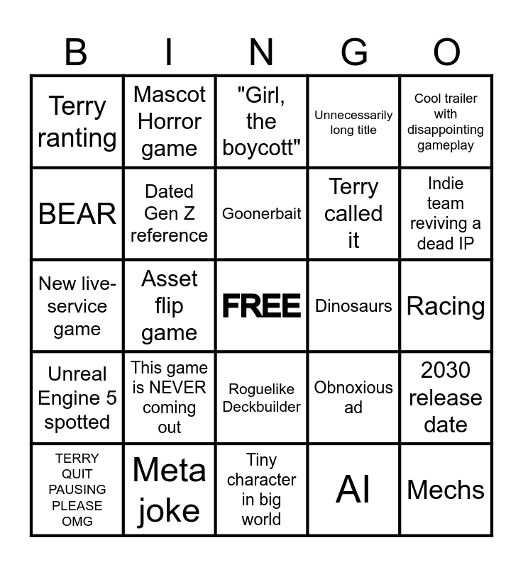 This bingo card has a free space and 41 words: Copyright music, New live-service game, Millennial humor, Dated Gen Z reference, Meta joke, Roguelike Deckbuilder, Goonerbait, Genshin-like, Cool trailer with disappointing gameplay, Unreal Engine 5 spotted, Asset flip game, Unnecessarily long title, Mechs, Racing, Dinosaurs, This game is NEVER coming out, Collab DLC announcement, Terry ranting, Copaganda, "Girl, the boycott", 2030 release date, Rapid fire showcase, Tiny character in big world, Terry called it, Simulator, Game that's already been announced, AI, *Spiritually* AI, Indie team reviving a dead IP, Celebrity cameo, "This could've been a tweet", Mascot Horror game, TERRY QUIT PAUSING PLEASE OMG, Trailer makes an Akira reference, Obnoxious ad, BEAR, A Strand-type experience, Frog!, Cozyslop, Nostalgiabait and Another cookie cutter shooter.