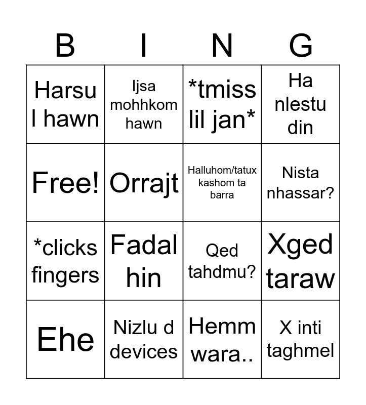 This bingo card has 16 words: Nizlu d devices, Xged taraw, *tmiss lil jan*, Harsu l hawn, *clicks fingers, Ijsa mohhkom hawn, Qed tahdmu?, Hemm wara.., Free!, Orrajt, Ehe, Ha nlestu din, Fadal hin, Nista nhassar?, Halluhom/tatux kashom ta barra and X inti taghmel.