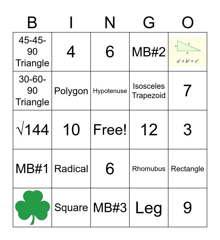 This bingo card has 2 images, a free space and 22 words: Radical, Square, Hypotenuse, 45-45-90 Triangle, 30-60-90 Triangle, 4, 12, 6, Isosceles Trapezoid, √144, Rhomubus, Rectangle, Polygon, Leg, 3, 6, 7, 10, 9, MB#1, MB#2 and MB#3.
