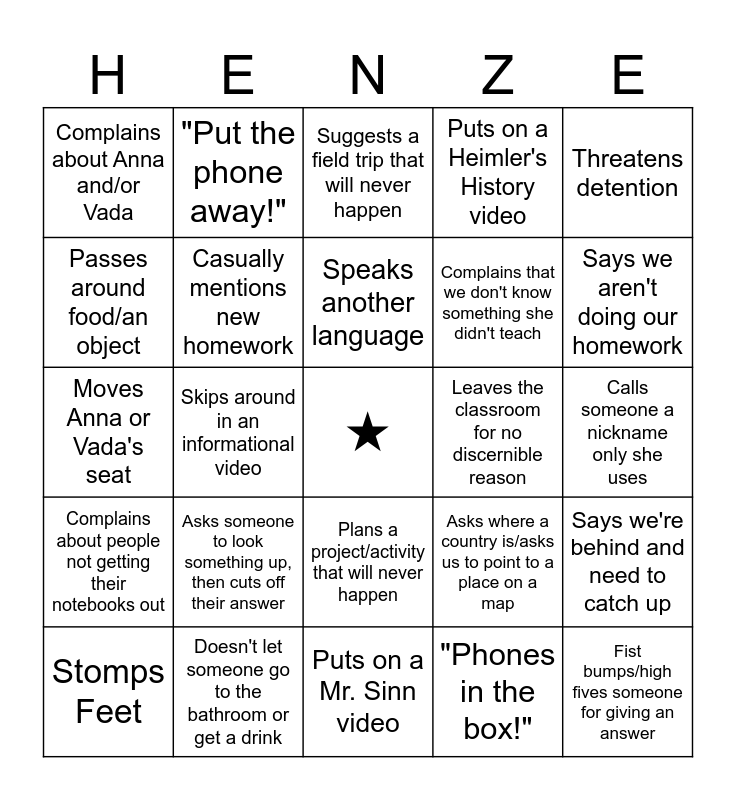 This bingo card has a free space and 29 words: Stomps Feet, Goes on tangent about something that happened to her at least a decade ago, Skips around in an informational video, Moves Andrew's seat, Complains about Anna and/or Vada, Suggests a field trip that will never happen, Casually mentions new homework, Asks someone to look something up, then cuts off their answer, Leaves the classroom for no discernible reason, Doesn't let someone go to the bathroom or get a drink, Calls someone a nickname only she uses, Fist bumps/high fives someone for giving an answer, Puts on a Mr. Sinn video, "Phones in the box!", Says we aren't doing our homework, Cracks a joke that only she actually laughs at, Plans a project/activity that will never happen, Complains about people not getting their notebooks out, Threatens detention, Moves Anna or Vada's seat, Asks where a country is/asks us to point to a place on a map, Asks an obvious question about something we just learned, Complains that we don't know something she didn't teach, Passes around food/an object, Puts on a Heimler's History video, "Put the phone away!", Says we're behind and need to catch up, Speaks another language and "Stop playing with your hair!" (or something similar).
