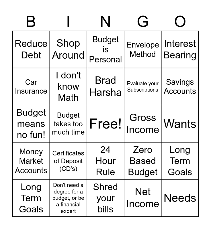 This bingo card has a free space and 31 words: Shred your bills, 50/30/20, Budget takes too much time, Short Term Goals, Reduce Debt, Budget is Personal, I don't know Math, Zero Based Budget, Gross Income, Net Income, Wants, Needs, Vacations, What is important to you?, Savings Accounts, Emergency Account, Long Term Goals, Certificates of Deposit (CD's), Money Market Accounts, 24 Hour Rule, Interest Bearing, Stick to your Budget, Long Term Goals, Shop Around, Evaluate your Subscriptions, Car Insurance, Envelope Method, Budget means no fun!, Don't need a degree for a budget, or be a financial expert, Brad Harsha and Amanda Downey.