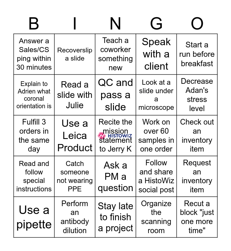This bingo card has a free space and 31 words: Stay late to finish a project, Find the HistoWiz BINGO cassette, Use a Leica Product, Identify a reagent by smell, Answer a Sales/CS ping within 30 minutes, Teach a coworker something new, Read a slide with Julie, Follow and share a HistoWiz social post, Work on over 60 samples in one order, Organize the scanning room, Check out an inventory item, Recut a block "just one more time", Say hello to Jeff, Actively work on a CQI, Decrease Adan's stress level, Pack an order for shipping, Request an inventory item, Catch someone not wearing PPE, Read and follow special instructions, Ask a PM a question, Start a run before breakfast, Manually scan a slide, Use a pipette, Recoverslip a slide, Look at a slide under a microscope, Explain to Adrien what coronal orientation is, Speak with a client, Fulfill 3 orders in the same day, Perform an antibody dilution, QC and pass a slide and Face a block perfectly on the first try.