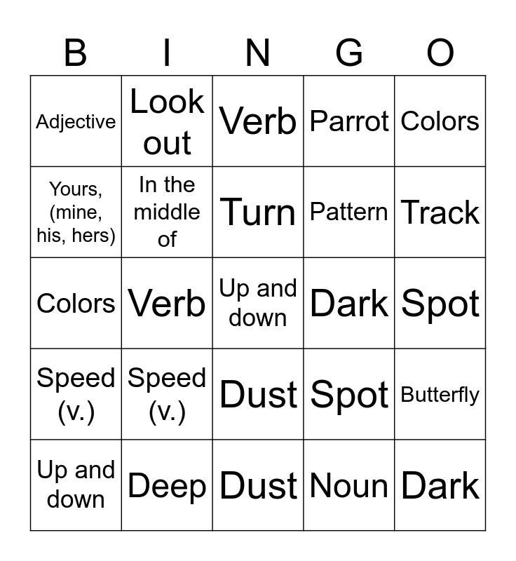 ⚠ This card has duplicate items: Track (2), Up and down (2), Go around (2), Dust (2), Speed (v.) (2), Take off (2), Look out (2), All the way back to (2), Yours, (mine, his, hers) (2), Deep (2), In the middle of (2), Parrot (2), Butterfly (2), Spot (2), little (2), Shine (2), Turn (2), Dark (2), Come up (2), Colors (2), Verb (2), Noun (2), Adjective (2), Pattern (2)