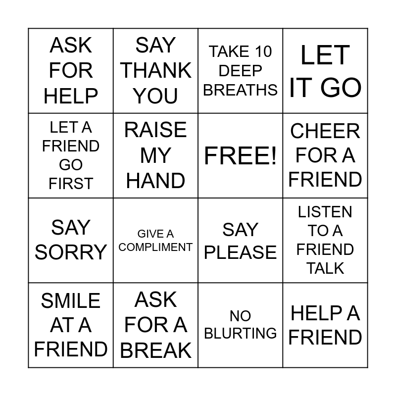 This bingo card has 25 words: SHARE A TOY, USE TEAMWORK, CHEER FOR A FRIEND, TAKE TURNS, LET A FRIEND GO FIRST, ASK FOR HELP, RAISE MY HAND, SAY THANK YOU, ASK FOR A BREAK, ASK A FRIEND TO PLAY, SAY SORRY, SAY PLEASE, SAY EXCUSE ME, GIVE SOMEONE ELSE A TURN, FREE!, WAIT FOR A TURN, NO BLURTING, TAKE 10 DEEP BREATHS, GIVE A COMPLIMENT, LISTEN TO A FRIEND TALK, SMILE AT A FRIEND, CLEAN UP AFTER YOURSELF, HELP A FRIEND, LET IT GO and ASK A FRIEND ABOUT THEMSELVES.