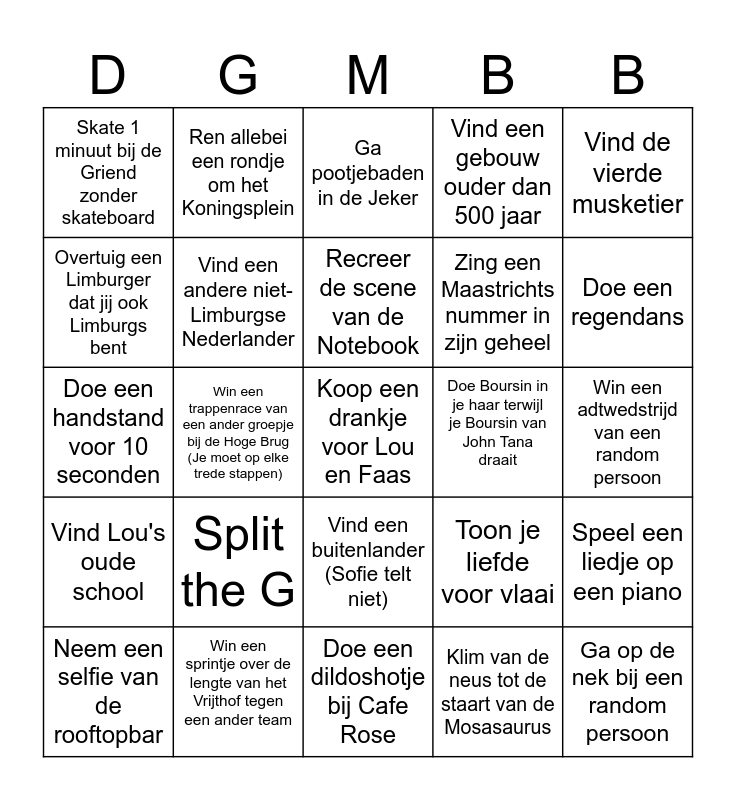 This bingo card has a free space and 24 words: Split the G, Win een sprintje over de lengte van het Vrijthof tegen een ander team, Recreer de scene van de Notebook, Neem een selfie van de rooftopbar, Vind de vierde musketier, Skate 1 minuut bij de Griend zonder skateboard, Overtuig een Limburger dat jij ook Limburgs bent, Ren allebei een rondje om het Koningsplein, Doe Boursin in je haar terwijl je Boursin van John Tana draait, Vind een buitenlander (Sofie telt niet), Zing een Maastrichts nummer in zijn geheel, Doe een handstand voor 10 seconden, Toon je liefde voor vlaai, Speel een liedje op een piano, Vind een andere niet-Limburgse Nederlander, Klim van de neus tot de staart van de Mosasaurus, Win een adtwedstrijd van een random persoon, Ga pootjebaden in de Jeker, Doe een regendans, Win een trappenrace van een ander groepje bij de Hoge Brug (Je moet op elke trede stappen), Ga op de nek bij een random persoon, Vind Lou's oude school, Vind een gebouw ouder dan 500 jaar and Doe een dildoshotje bij Cafe Rose.