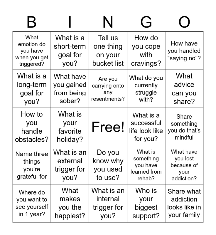 This bingo card has a free space and 24 words: What is an external trigger for you?, What makes you the happiest?, Are you carrying onto any resentments?, Where do you want to see yourself in 1 year?, How have you handled "saying no"?, What emotion do you have when you get triggered?, What is a long-term goal for you?, What is a short-term goal for you?, What is a successful life look like for you?, Do you know why you used to use?, What do you currently struggle with?, How to you handle obstacles?, What is something you have learned from rehab?, What have you lost because of your addiction?, What have you gained from being sober?, Who is your biggest support?, Share something you do that's mindful, Tell us one thing on your bucket list, What advice can you share?, What is your favorite holiday?, Share what addiction looks like in your family, Name three things you're grateful for, How do you cope with cravings? and What is an internal trigger for you?.