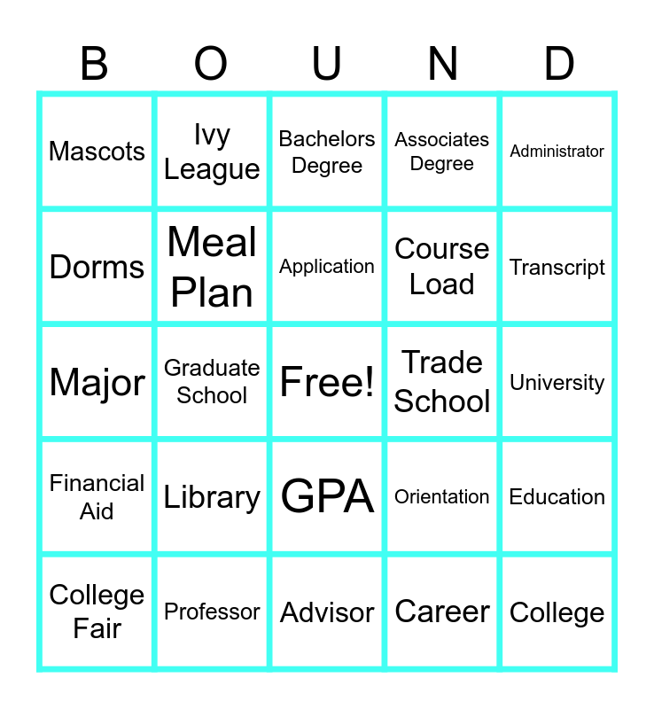 This bingo card has a free space and 24 words: Library, Professor, Application, College Fair, Administrator, Mascots, Dorms, Ivy League, Trade School, GPA, Course Load, Major, Orientation, Education, Meal Plan, Career, University, Bachelors Degree, Transcript, Graduate School, College, Financial Aid, Associates Degree and Advisor.