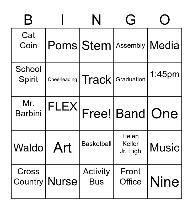 This bingo card has a free space and 32 words: Front Office, Teal and Navy, FLEX, Advisory, Waldo, Cheerleading, Media, Music, Poms, Mr. Cooprider, Track, Stem, Orchestra, Volleyball, Band, Spanish, Cross Country, Mr. Barbini, Basketball, Art, Helen Keller Jr. High, Wildcat, One, Nurse, Nine, Assembly, Graduation, School Spirit, Cat Coin, Activity Bus, 2:15pm and 1:45pm.