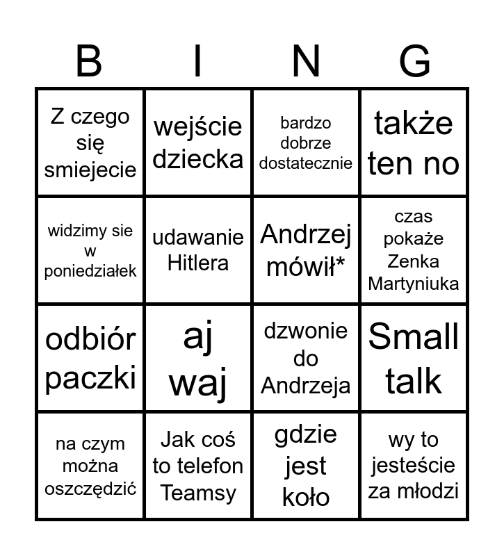 This bingo card has 16 words: Jak coś to telefon Teamsy, Small talk, bardzo dobrze dostatecznie, Z czego się smiejecie, odbiór paczki, wejście dziecka, dzwonie do Andrzeja, gdzie jest koło, widzimy sie w poniedziałek, udawanie Hitlera, na czym można oszczędzić, także ten no, aj waj, czas pokaże Zenka Martyniuka, Andrzej mówił* and wy to jesteście za młodzi.