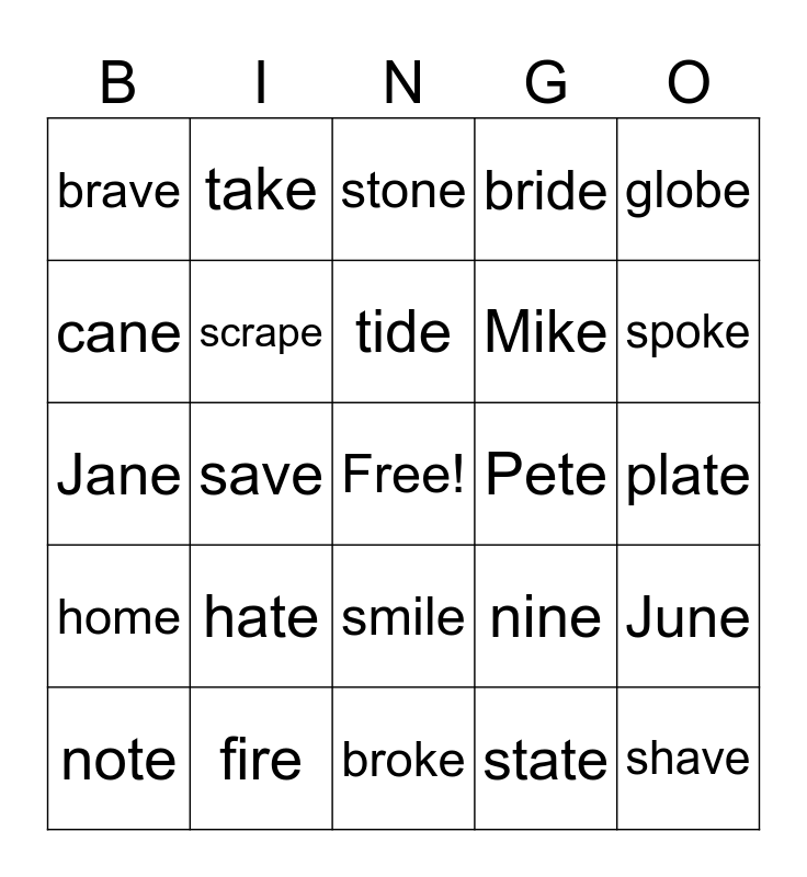 This bingo card has a free space and 39 words: spine, bike, lake, scrape, note, smile, tide, shape, globe, home, save, bride, shave, plate, Pete, hate, vote, brave, joke, nine, cane, broke, Mike, spoke, file, dime, snake, grape, wipe, take, white, take, stone, fire, state, bake, June, Jane and Kate.
