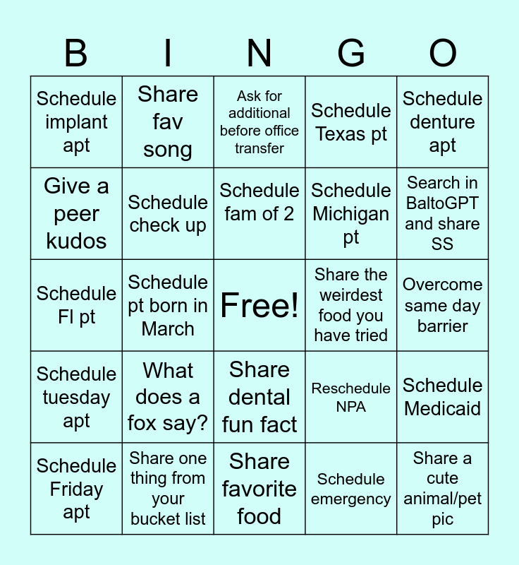 This bingo card has a free space and 24 words: What does a fox say?, Share one thing from your bucket list, Schedule fam of 2, Schedule Friday apt, Schedule denture apt, Schedule implant apt, Give a peer kudos, Share fav song, Share the weirdest food you have tried, Share dental fun fact, Schedule Michigan pt, Schedule Fl pt, Reschedule NPA, Schedule Medicaid, Schedule check up, Schedule emergency, Overcome same day barrier, Ask for additional before office transfer, Search in BaltoGPT and share SS, Schedule pt born in March, Share a cute animal/pet pic, Schedule tuesday apt, Schedule Texas pt and Share favorite food.