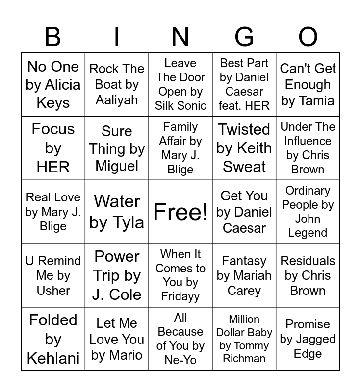 This bingo card has a free space and 29 words: Folded by Kehlani, Made For Me by Muni Long, Water by Tyla, No Scrubs by TLC, No One by Alicia Keys, Leave The Door Open by Silk Sonic, Sure Thing by Miguel, Power Trip by J. Cole, Get You by Daniel Caesar, Let Me Love You by Mario, Ordinary People by John Legend, Promise by Jagged Edge, All Because of You by Ne-Yo, Million Dollar Baby by Tommy Richman, Under The Influence by Chris Brown, Snooze by SZA, When It Comes to You by Fridayy, U Remind Me by Usher, Can't Get Enough by Tamia, Real Love by Mary J. Blige, Fantasy by Mariah Carey, All My Life by K-Ci & JoJo, Twisted by Keith Sweat, Focus by HER, Best Part by Daniel Caesar feat. HER, Rock The Boat by Aaliyah, Residuals by Chris Brown, Family Affair by Mary J. Blige and What About Your Friends by TLC.