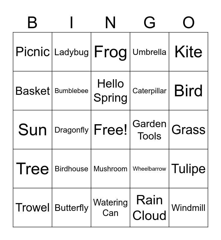 This bingo card has a free space and 24 words: Birdhouse, Butterfly, Hello Spring, Trowel, Kite, Picnic, Basket, Ladybug, Garden Tools, Mushroom, Caterpillar, Sun, Wheelbarrow, Tulipe, Bumblebee, Rain Cloud, Grass, Frog, Bird, Dragonfly, Windmill, Tree, Umbrella and Watering Can.