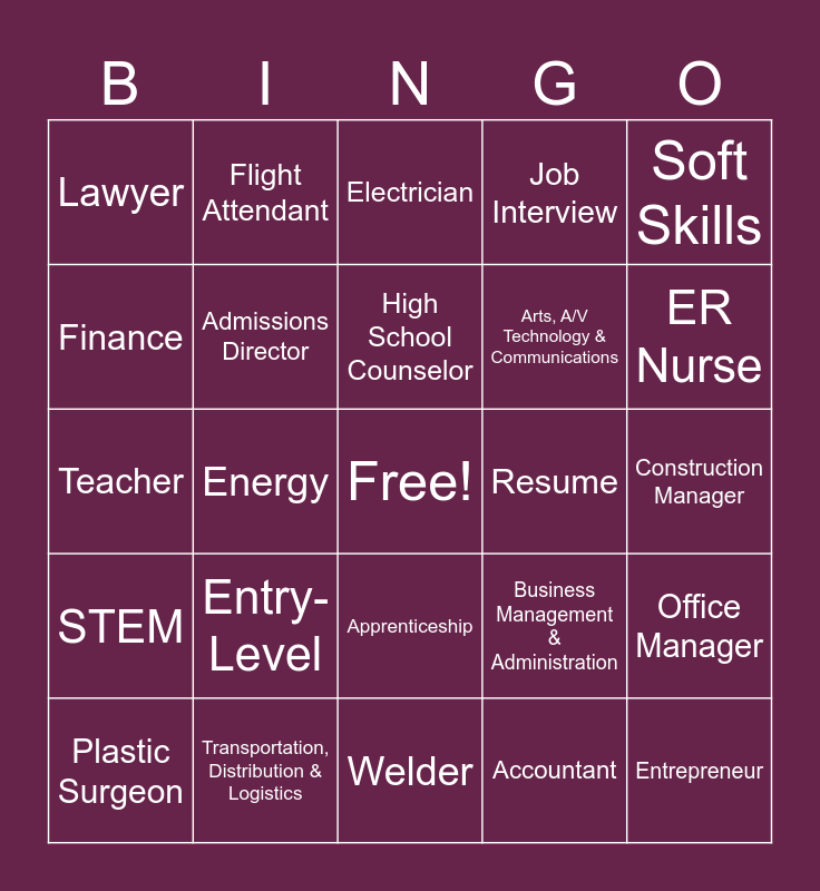 This bingo card has a free space and 44 words: Agriculture, Food & Natural Resources, Entrepreneur, Health Science, Plastic Surgeon, Cosmetologist, Accountant, Electrician, Architecture & Construction, Soft Skills, Transportation, Distribution & Logistics, Job Interview, Resume, Apprenticeship, Entry-Level, Personal Chef, Welder, Internship, Teacher, Urban Planner, ER Nurse, Flight Attendant, Trade School, Graphic Designer, Lawyer, Engineer, Construction Manager, Law, Public Safety, Corrections & Security, Hospitality & Tourism, Business Management & Administration, STEM, Nail Technician, Office Manager, Education & Training, Human Services, Energy, Information Technology (IT), Video Game Designer, CFO, High School Counselor, Finance, Arts, A/V Technology & Communications, STEM, Admissions Director and Architect.
