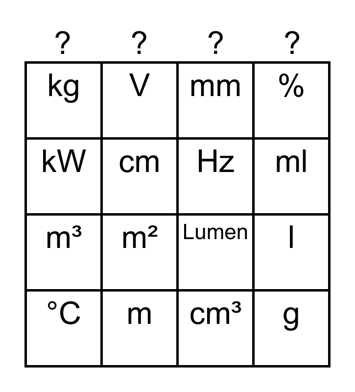 This bingo card has 16 words: m, l, mm, kg, m³, V, Lumen, cm³, kW, cm, °C, %, m², ml, Hz and g.