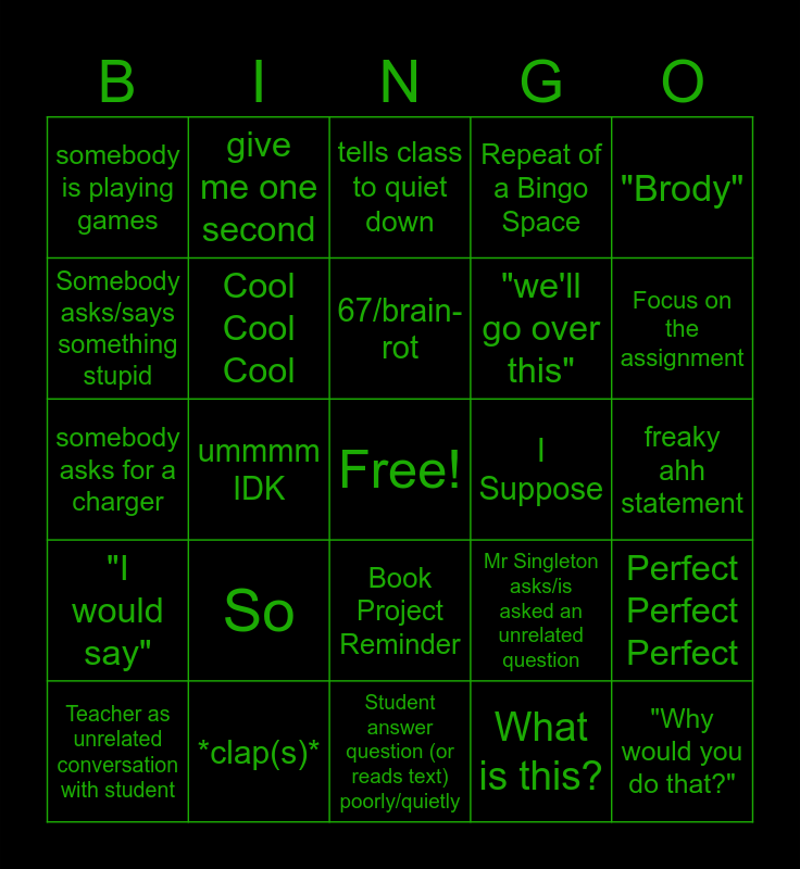 This bingo card has a free space and 35 words: Alright, "Carson", "Jackson", Cool Cool Cool, Book Project Reminder, Repeat of a Bingo Space, Somebody asks/says something stupid, Needoh mentioned, 67/brain-rot, "Find your sets", somebody asks for a charger, "Brody", Bryson Takes a Nap, Bryson Does not do work, somebody is playing games, I Suppose, What is this?, ummmm IDK, "I would say", "Why would you do that?", Mr Singleton asks/is asked an unrelated question, Teacher as unrelated conversation with student, Perfect Perfect Perfect, *clap(s)*, tells class to quiet down, Focus on the assignment, Trump mentioned, Five seconds of silence after a question is asked, "we'll go over this", freaky ahh statement, Mr Singleton gives a non-answer, Student answer question (or reads text) poorly/quietly, So, give me one second and somebody is out of their seat.
