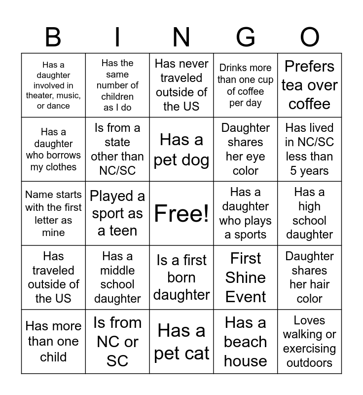 This bingo card has a free space and 24 words: Has a middle school daughter, Is from NC or SC, Has a pet dog, Has more than one child, Prefers tea over coffee, Has a daughter involved in theater, music, or dance, Has a daughter who borrows my clothes, Has the same number of children as I do, Has a daughter who plays a sports, Is a first born daughter, Daughter shares her eye color, Name starts with the first letter as mine, First Shine Event, Daughter shares her hair color, Is from a state other than NC/SC, Has a beach house, Has a high school daughter, Has never traveled outside of the US, Has lived in NC/SC less than 5 years, Played a sport as a teen, Loves walking or exercising outdoors, Has traveled outside of the US, Drinks more than one cup of coffee per day and Has a pet cat.
