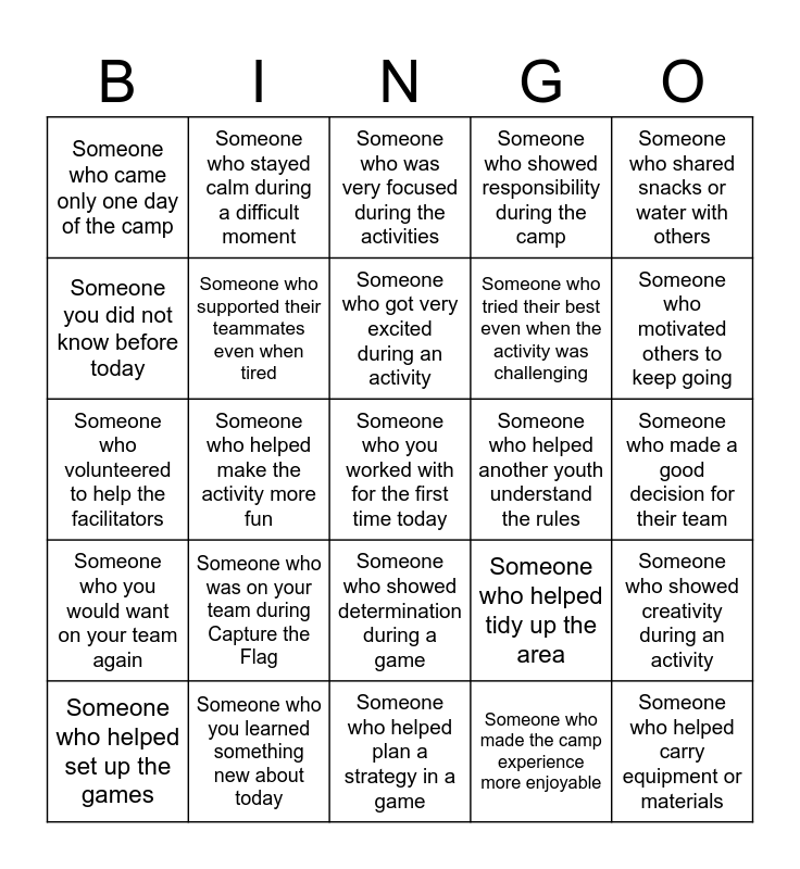 This bingo card has 25 words: Someone who was on your team during Capture the Flag, Someone who helped plan a strategy in a game, Someone who got very excited during an activity, Someone who helped set up the games, Someone who shared snacks or water with others, Someone who came only one day of the camp, Someone you did not know before today, Someone who stayed calm during a difficult moment, Someone who helped another youth understand the rules, Someone who showed determination during a game, Someone who tried their best even when the activity was challenging, Someone who volunteered to help the facilitators, Someone who helped tidy up the area, Someone who showed creativity during an activity, Someone who supported their teammates even when tired, Someone who helped carry equipment or materials, Someone who made a good decision for their team, Someone who was very focused during the activities, Someone who motivated others to keep going, Someone who helped make the activity more fun, Someone who you worked with for the first time today, Someone who you learned something new about today, Someone who you would want on your team again, Someone who showed responsibility during the camp and Someone who made the camp experience more enjoyable.