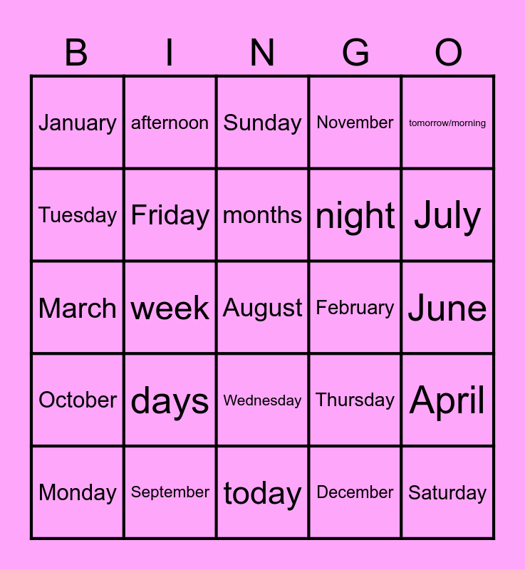 This bingo card has 25 words: days, today, months, Monday, tomorrow/morning, January, Tuesday, afternoon, February, Wednesday, night, March, Thursday, April, Friday, Saturday, June, Sunday, July, week, August, September, October, November and December.