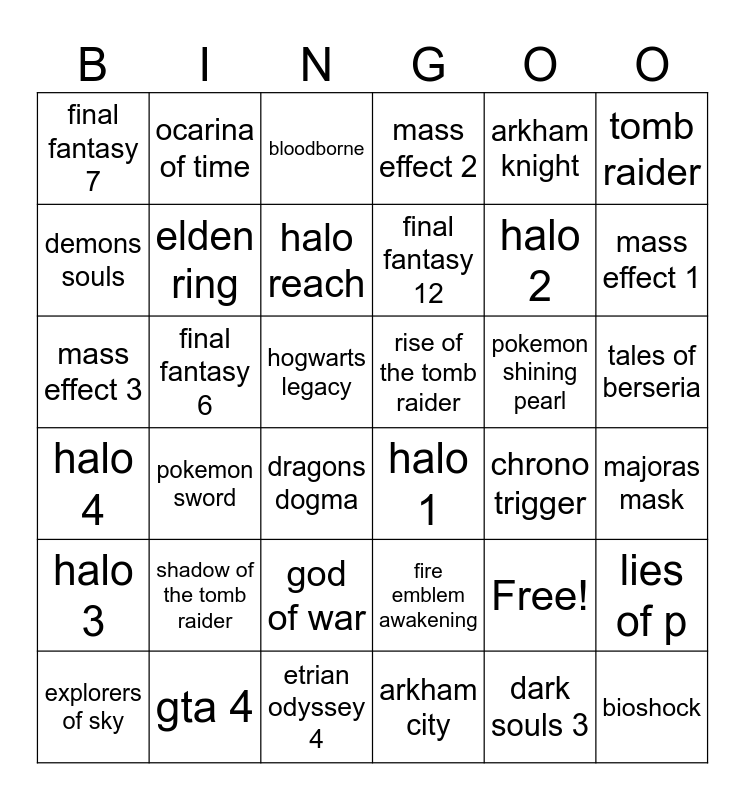This bingo card has 37 words: Free!, fire emblem awakening, dark souls 3, demons souls, pokemon sword, pokemon shining pearl, elden ring, arkham city, arkham knight, explorers of sky, mass effect 1, mass effect 2, mass effect 3, hogwarts legacy, tomb raider, rise of the tomb raider, shadow of the tomb raider, bloodborne, tales of berseria, final fantasy 6, final fantasy 7, final fantasy 12, dragons dogma, chrono trigger, gta 4, majoras mask, ocarina of time, etrian odyssey 4, lies of p, god of war, god of war ragnarok, halo 1, halo 2, halo 3, halo 4, halo reach and bioshock.