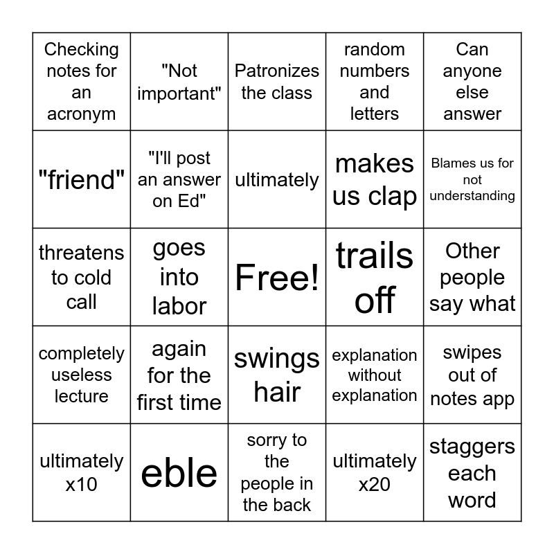 This bingo card has a free space and 24 words: again for the first time, eble, ultimately, ultimately x10, Can anyone else answer, Checking notes for an acronym, "friend", "Not important", trails off, swings hair, makes us clap, threatens to cold call, explanation without explanation, swipes out of notes app, "I'll post an answer on Ed", ultimately x20, Other people say what, Patronizes the class, Blames us for not understanding, goes into labor, staggers each word, completely useless lecture, random numbers and letters and sorry to the people in the back.