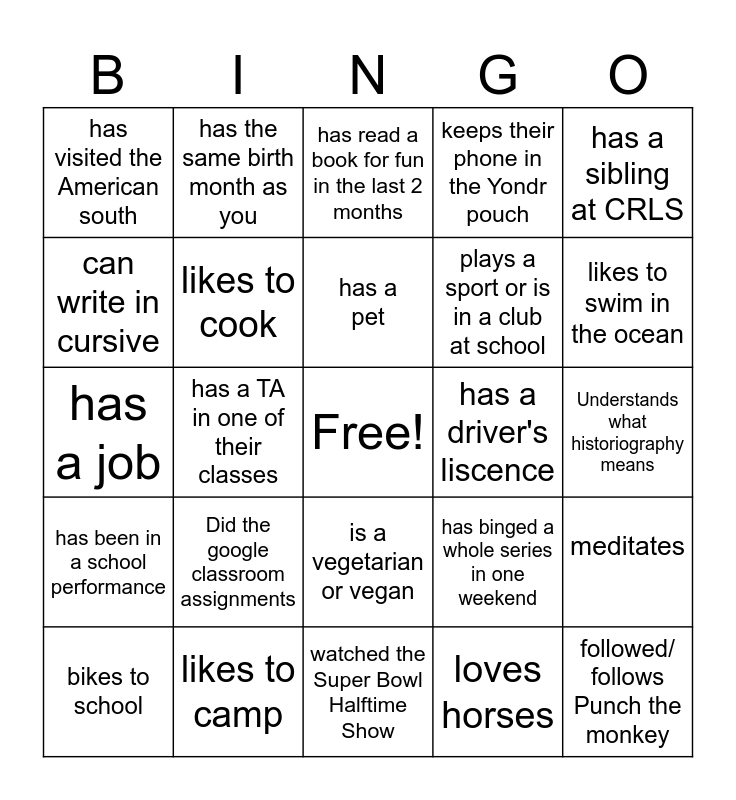 This bingo card has a free space and 24 words: Did the google classroom assignments, likes to camp, has a pet, bikes to school, has a sibling at CRLS, has visited the American south, can write in cursive, has the same birth month as you, has a driver's liscence, is a vegetarian or vegan, plays a sport or is in a club at school, has a job, has binged a whole series in one weekend, meditates, likes to cook, loves horses, Understands what historiography means, has read a book for fun in the last 2 months, likes to swim in the ocean, has a TA in one of their classes, followed/ follows Punch the monkey, has been in a school performance, keeps their phone in the Yondr pouch and watched the Super Bowl Halftime Show.