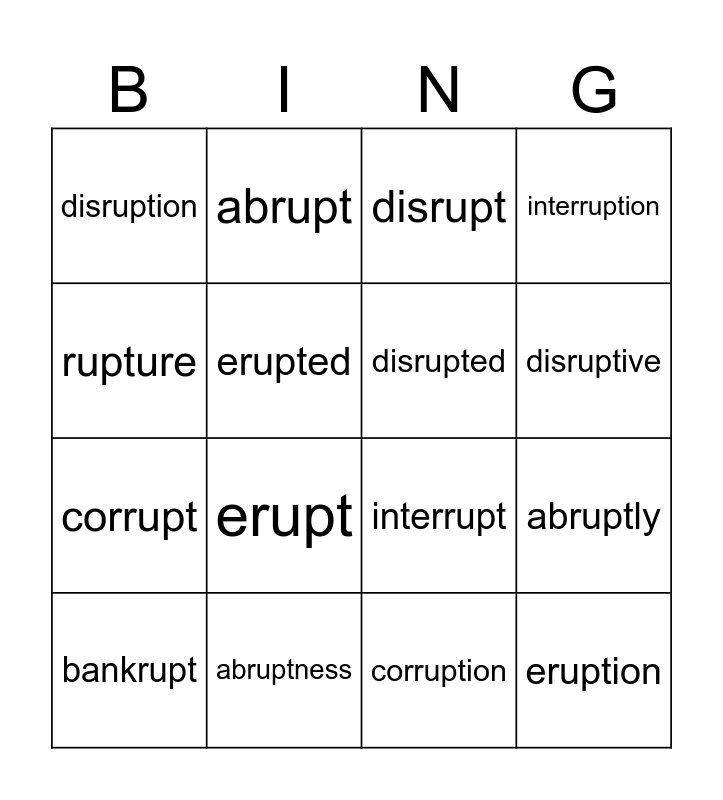 This bingo card has 18 words: erupt, eruption, disrupt, disruption, interrupt, interruption, bankrupt, abrupt, disruptive, corrupt, corruption, rupture, abruptly, erupted, disrupted, interrupted, abruptness and corrupted.