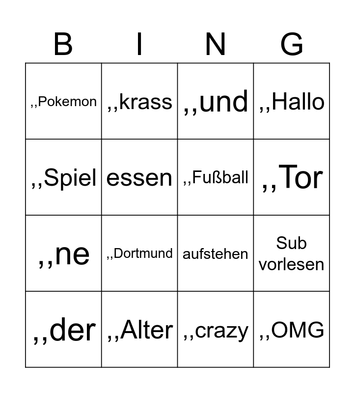 This bingo card has 16 words: ,,Alter, Sub vorlesen, ,,und, ,,Pokemon, ,,ne, ,,krass, aufstehen, ,,crazy, ,,Spiel, essen, ,,der, ,,Hallo, ,,Dortmund, ,,Tor, ,,Fußball and ,,OMG.