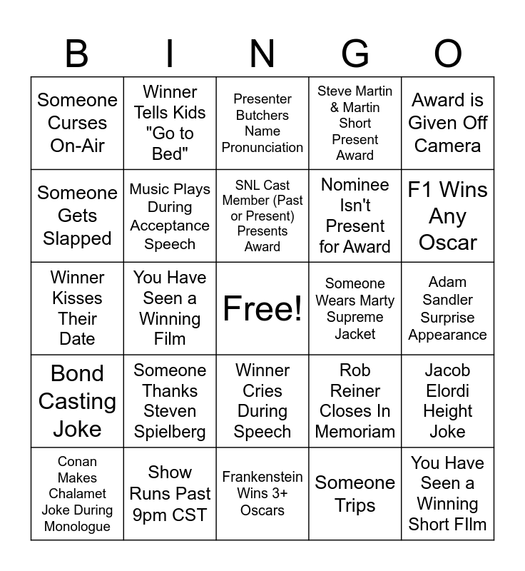 This bingo card has a free space and 24 words: Someone Thanks Steven Spielberg, Show Runs Past 9pm CST, SNL Cast Member (Past or Present) Presents Award, Conan Makes Chalamet Joke During Monologue, Award is Given Off Camera, Someone Curses On-Air, Someone Gets Slapped, Winner Tells Kids "Go to Bed", Someone Wears Marty Supreme Jacket, Winner Cries During Speech, Nominee Isn't Present for Award, Winner Kisses Their Date, Rob Reiner Closes In Memoriam, Jacob Elordi Height Joke, Music Plays During Acceptance Speech, Someone Trips, Adam Sandler Surprise Appearance, Presenter Butchers Name Pronunciation, F1 Wins Any Oscar, You Have Seen a Winning Film, You Have Seen a Winning Short FIlm, Bond Casting Joke, Steve Martin & Martin Short Present Award and Frankenstein Wins 3+ Oscars.