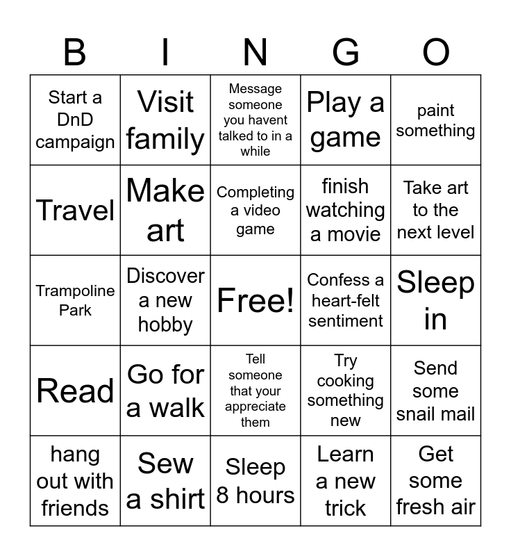 This bingo card has a free space and 24 words: Go for a walk, Sew a shirt, Completing a video game, hang out with friends, paint something, Start a DnD campaign, Travel, Visit family, Confess a heart-felt sentiment, Tell someone that your appreciate them, finish watching a movie, Trampoline Park, Try cooking something new, Send some snail mail, Make art, Learn a new trick, Sleep in, Message someone you havent talked to in a while, Take art to the next level, Discover a new hobby, Get some fresh air, Read, Play a game and Sleep 8 hours.