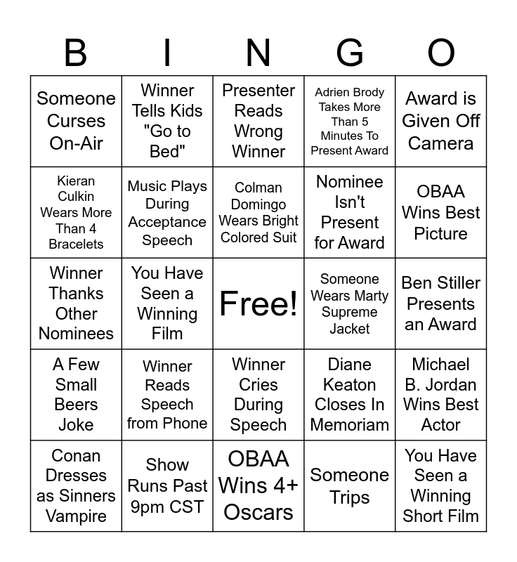 This bingo card has a free space and 24 words: Winner Reads Speech from Phone, Show Runs Past 9pm CST, Colman Domingo Wears Bright Colored Suit, Conan Dresses as Sinners Vampire, Award is Given Off Camera, Someone Curses On-Air, Kieran Culkin Wears More Than 4 Bracelets, Winner Tells Kids "Go to Bed", Someone Wears Marty Supreme Jacket, Winner Cries During Speech, Nominee Isn't Present for Award, Winner Thanks Other Nominees, Diane Keaton Closes In Memoriam, Michael B. Jordan Wins Best Actor, Music Plays During Acceptance Speech, Someone Trips, Ben Stiller Presents an Award, Presenter Reads Wrong Winner, OBAA Wins Best Picture, You Have Seen a Winning Film, You Have Seen a Winning Short Film, A Few Small Beers Joke, Adrien Brody Takes More Than 5 Minutes To Present Award and OBAA Wins 4+ Oscars.