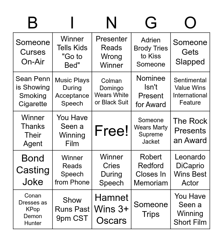 This bingo card has a free space and 24 words: Winner Reads Speech from Phone, Show Runs Past 9pm CST, Colman Domingo Wears White or Black Suit, Conan Dresses as KPop Demon Hunter, Someone Gets Slapped, Someone Curses On-Air, Sean Penn is Showing Smoking Cigarette, Winner Tells Kids "Go to Bed", Someone Wears Marty Supreme Jacket, Winner Cries During Speech, Nominee Isn't Present for Award, Winner Thanks Their Agent, Robert Redford Closes In Memoriam, Leonardo DiCaprio Wins Best Actor, Music Plays During Acceptance Speech, Someone Trips, The Rock Presents an Award, Presenter Reads Wrong Winner, Sentimental Value Wins International Feature, You Have Seen a Winning Film, You Have Seen a Winning Short Film, Bond Casting Joke, Adrien Brody Tries to Kiss Someone and Hamnet Wins 3+ Oscars.