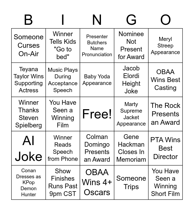 This bingo card has a free space and 24 words: Winner Reads Speech from Phone, Show Finishes Runs Past 9pm CST, Baby Yoda Appearance, Conan Dresses as KPop Demon Hunter, Meryl Streep Appearance, Someone Curses On-Air, Teyana Taylor Wins Supporting Actress, Winner Tells Kids "Go to bed", Marty Supreme Jacket Appearance, Colman Domingo Presents an Award, Jacob Elordi Height Joke, Winner Thanks Steven Spielberg, Gene Hackman Closes In Memoriam, PTA Wins Best Director, Music Plays During Acceptance Speech, Someone Trips, The Rock Presents an Award, Presenter Butchers Name Pronunciation, OBAA Wins Best Casting, You Have Seen a Winning Film, You Have Seen a Winning Short Film, AI Joke, Nominee Not Present for Award and OBAA Wins 4+ Oscars.