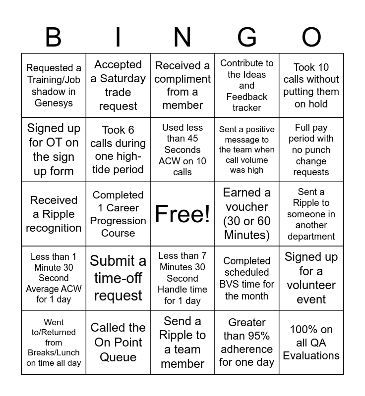 This bingo card has a free space and 24 words: Submit a time-off request, Called the On Point Queue, Used less than 45 Seconds ACW on 10 calls, Went to/Returned from Breaks/Lunch on time all day, Took 10 calls without putting them on hold, Requested a Training/Job shadow in Genesys, Signed up for OT on the sign up form, Accepted a Saturday trade request, Earned a voucher (30 or 60 Minutes), Less than 7 Minutes 30 Second Handle time for 1 day, Sent a positive message to the team when call volume was high, Received a Ripple recognition, Completed scheduled BVS time for the month, Signed up for a volunteer event, Took 6 calls during one high-tide period, Greater than 95% adherence for one day, Sent a Ripple to someone in another department, Received a compliment from a member, Full pay period with no punch change requests, Completed 1 Career Progression Course, 100% on all QA Evaluations, Less than 1 Minute 30 Second Average ACW for 1 day, Contribute to the Ideas and Feedback tracker and Send a Ripple to a team member.