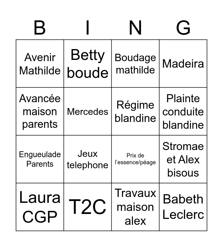 This bingo card has 16 words: T2C, Stromae et Alex bisous, Boudage mathilde, Avenir Mathilde, Engueulade Parents, Betty boude, Prix de l’essence/péage, Travaux maison alex, Avancée maison parents, Mercedes, Laura CGP, Madeira, Jeux telephone, Plainte conduite blandine, Régime blandine and Babeth Leclerc.