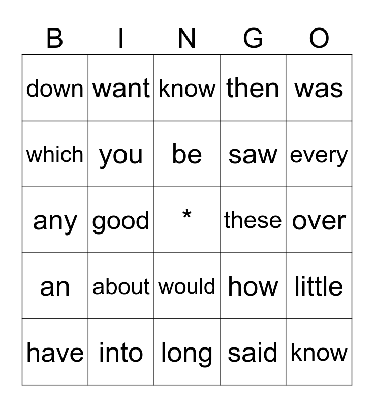 This bingo card has a free space and 24 words: about, into, be, have, was, down, which, want, these, would, saw, any, how, little, you, said, over, know, every, good, know, an, then and long.