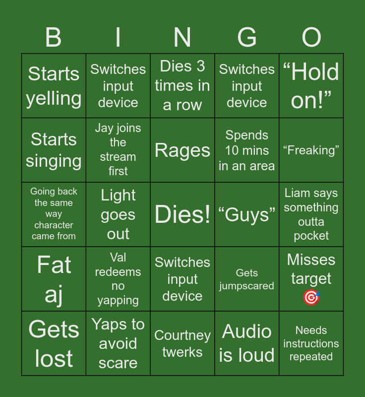 This bingo card has a free space and 29 words: Switches input device, Yaps to avoid scare, Dies 3 times in a row, Takes a shot, “Hold on!”, Starts yelling, Jay joins the stream first, Rages, “Guys”, Misses target🎯, Gets lost, Light goes out, Audio is loud, Needs instructions repeated, Going back the same way character came from, Doesn’t land jump in first try, Courtney twerks, Gets jumpscared, “Freaking”, Fat aj, Val redeems no yapping, Gains a follower, Spends 10 mins in an area, Liam says something outta pocket, Starts singing, Switches input device, Switches input device, Switches input device and Switches input device.