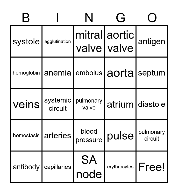 This bingo card has 34 words: Free!, erythrocytes, leukocytes, thrombocytes, hemostasis, anemia, antigen, antibody, agglutination, thrombus, embolus, mitral valve, tricuspid valve, ventricle, atrium, septum, capillaries, veins, arteries, pulse, blood pressure, myocardium, systole, diastole, SA node, pulmonary valve, aortic valve, vena cava, aorta, hemoglobin, plasma, systemic circuit, pulmonary circuit and chordae tendineae.