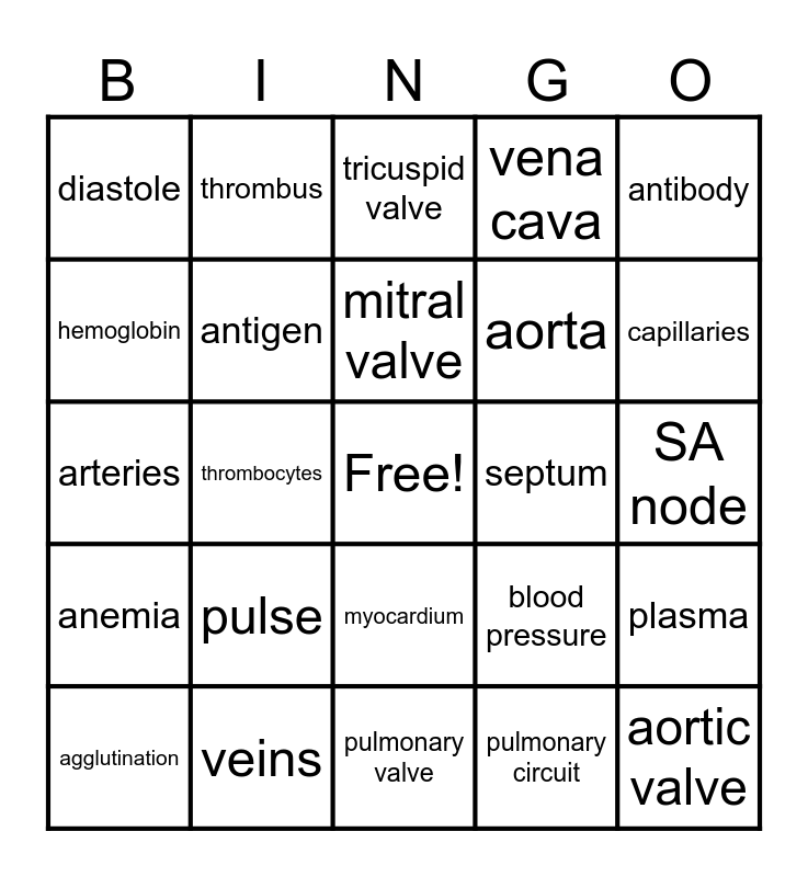 This bingo card has a free space and 33 words: erythrocytes, leukocytes, thrombocytes, hemostasis, anemia, antigen, antibody, agglutination, thrombus, embolus, mitral valve, tricuspid valve, ventricle, atrium, septum, capillaries, veins, arteries, pulse, blood pressure, myocardium, systole, diastole, SA node, pulmonary valve, aortic valve, vena cava, aorta, hemoglobin, plasma, systemic circuit, pulmonary circuit and chordae tendineae.