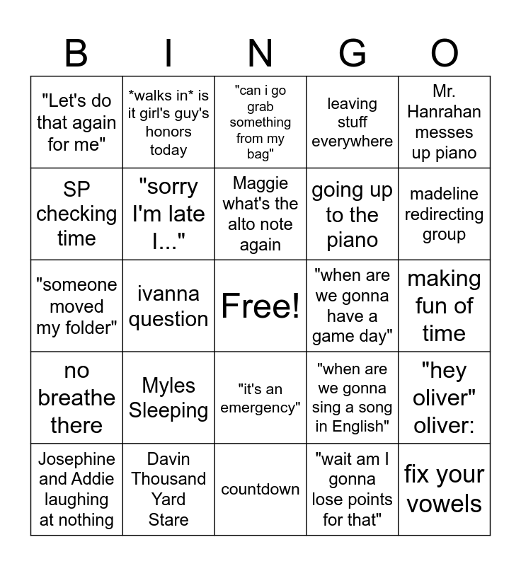 This bingo card has a free space and 24 words: Myles Sleeping, Davin Thousand Yard Stare, Maggie what's the alto note again, Josephine and Addie laughing at nothing, Mr. Hanrahan messes up piano, "Let's do that again for me", SP checking time, *walks in* is it girl's guy's honors today, "when are we gonna have a game day", "it's an emergency", going up to the piano, "someone moved my folder", "when are we gonna sing a song in English", "hey oliver" oliver:, "sorry I'm late I...", "wait am I gonna lose points for that", making fun of time, "can i go grab something from my bag", madeline redirecting group, ivanna question, fix your vowels, no breathe there, leaving stuff everywhere and countdown.