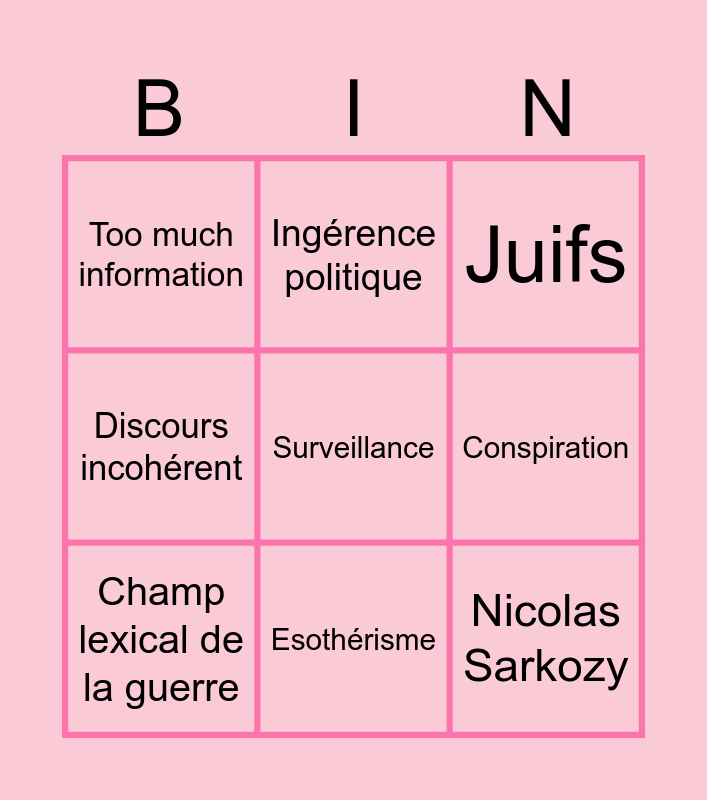 This bingo card has a free space and 8 words: Conspiration, Juifs, Ingérence politique, Champ lexical de la guerre, Too much information, Nicolas Sarkozy, Discours incohérent and Esothérisme.