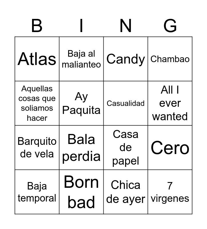 This bingo card has 23 words: 7 virgenes, Algo como tu, All I ever wanted, Antes de perderte, Aquellas cosas que soliamos hacer, Atlas, Ay Paquita, Baja al malianteo, Baja temporal, Bajo la luna, Bala perdia, Barquito de vela, Beste zerbait, Bien duro, Born bad, Buona sera, Candy, Casa de papel, Casualidad, Cero, Chambao, Chica de ayer and Ciega sordomuda, Clandestino, Coco loco, Conmigo sin ti, Contacto, Criminal, Cuando me dirá, Cuando no era cantante, Cúrame, Di mi nombre, Diri diri, Dónde te escondes?, Dostoyevsky, Down, Do you remember?, Drama, Dulce introducción al caos, Dut.