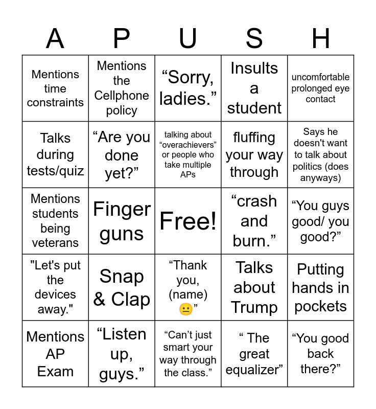 This bingo card has a free space and 25 words: Snap & Clap, “Can’t just smart your way through the class.”, talking about “overachievers” or people who take multiple APs, Mentions AP Exam, uncomfortable prolonged eye contact, Mentions time constraints, Talks during tests/quiz, Mentions the Cellphone policy, “crash and burn.”, “Thank you, (name) 😐”, fluffing your way through, Mentions students being veterans, Talks about Trump, Putting hands in pockets, “Are you done yet?”, Calls someone a slacker, “You guys good/ you good?”, “Sorry, ladies.”, Says he doesn't want to talk about politics (does anyways), Finger guns, “You good back there?”, “Listen up, guys.”, "Let's put the devices away.", Insults a student and “ The great equalizer”.