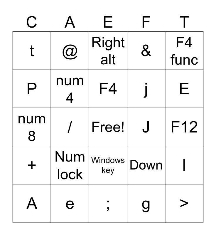 This bingo card has a free space and 167 words: Esc, F1, F2, F3, F4, F5, F6, F7, F8, F9, F10, F11, F12, Insert, Delete, `, 1, 2, 3, 4, 5, 6, 7, 8, 9, 0, -, =, Backspace, Tab, q, w, e, r, t, y, u, i, o, p, [, ], \, Caps lock, a, s, d, f, g, h, j, k, l, ;, ', Enter, Left shift, z, x, c, v, b, n, m, ,, ., /, Right shift, Left ctrl, Windows key, Left alt, Space, Right alt, Fn, Right ctrl, Up, Down, Left, Right, ~, !, @, #, $, %, ^, &, *, (, ), _, +, Q, W, E, R, T, Y, U, I, O, P, {, }, |, A, S, D, F, G, H, J, K, L, :, ", Z, X, C, V, B, N, M, <, >, ?, home, end, Pg up, Pg dn, Num lock, num /, num *, num -, num 7, num 8, num 9, + top half, num 4, num 5, num 6, + bottom half, num 1, num 2, num 3, enter top half, num 0, num ., enter bottom half, ins on 0 key, del on . key, F1 func, F2 func, F3 func, F4 func, F5 func, F6 func, F7 func, F8 func, F9 func, F10 func, F11 func, F12 func, Print scr, Pause/B, Pg Up func and Pg Dn func.